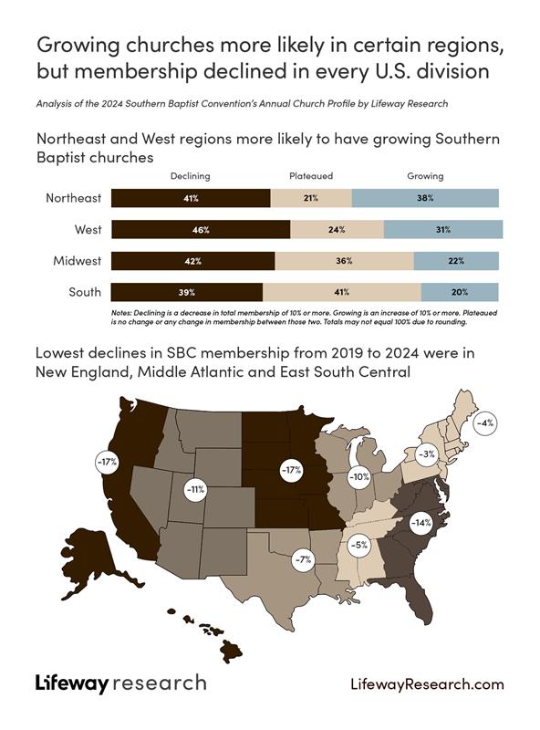 Recent Lifeway Research analysis of the 2024 Annual Church Profile reveals a membership decline among existing Southern Baptist churches across every region of the United States, and a convention composed of a growing percentage of the smallest churches. The statistical analysis also reveals, however, certain types of congregations that were more likely to be growing.