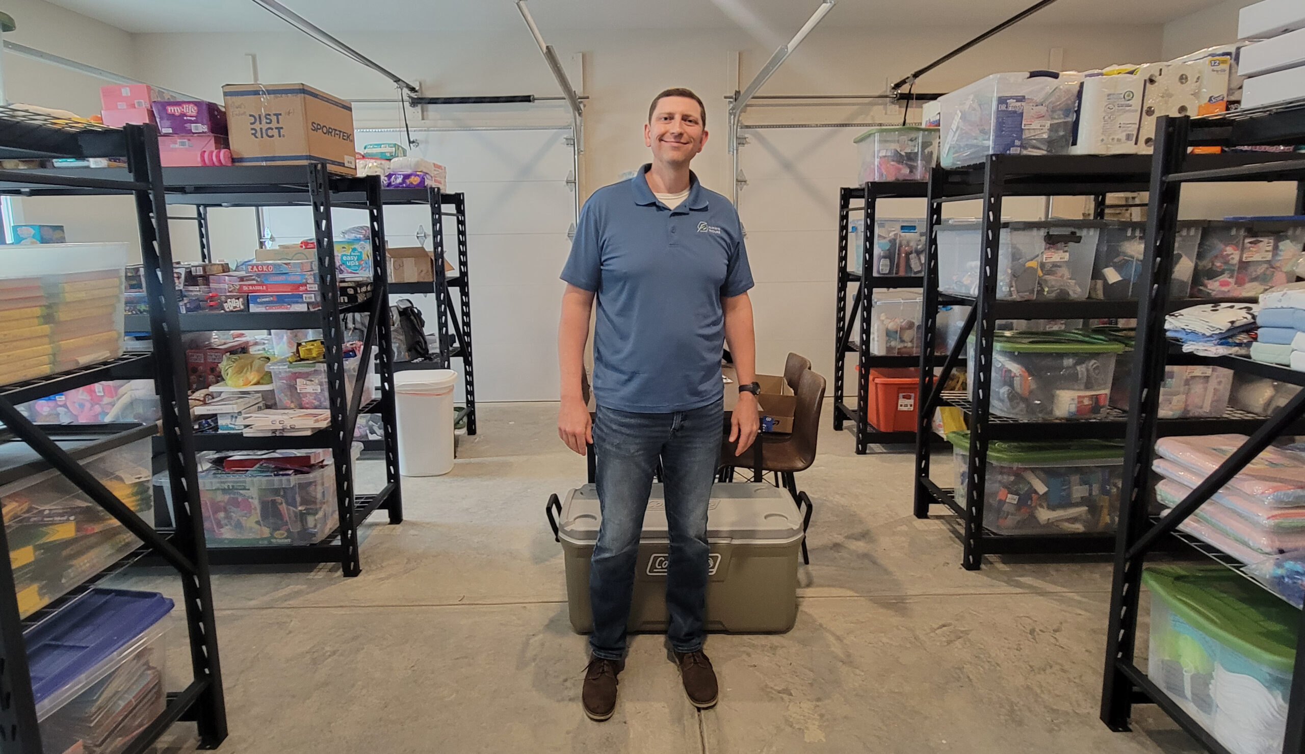 Corey Buckner, founder of Always Endure, stands among rows of supplies destined for children in foster care.